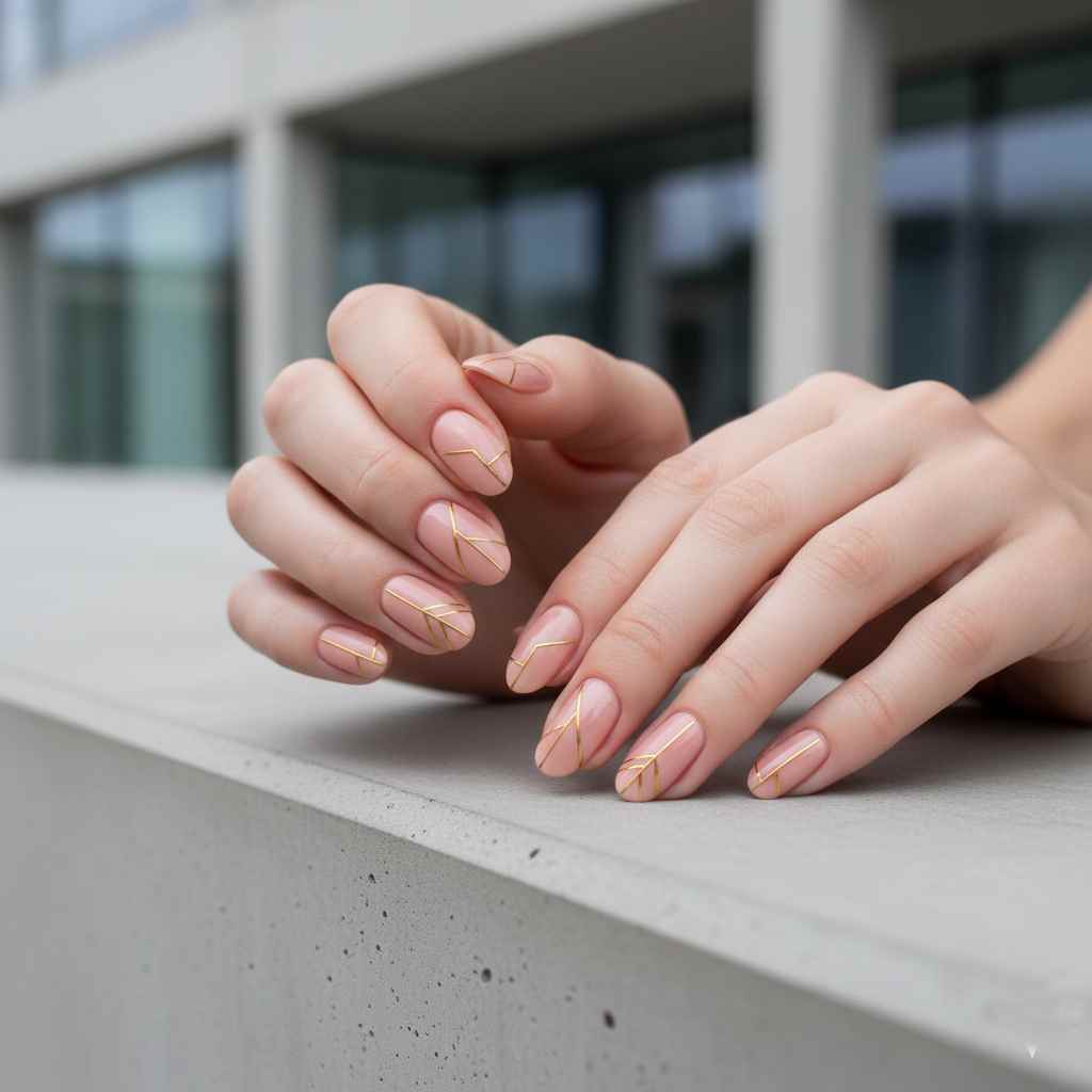 Soft peachy nude with delicate thin gold geometric lines creates modern minimalism. The metallic details add interest without overwhelming the natural base.