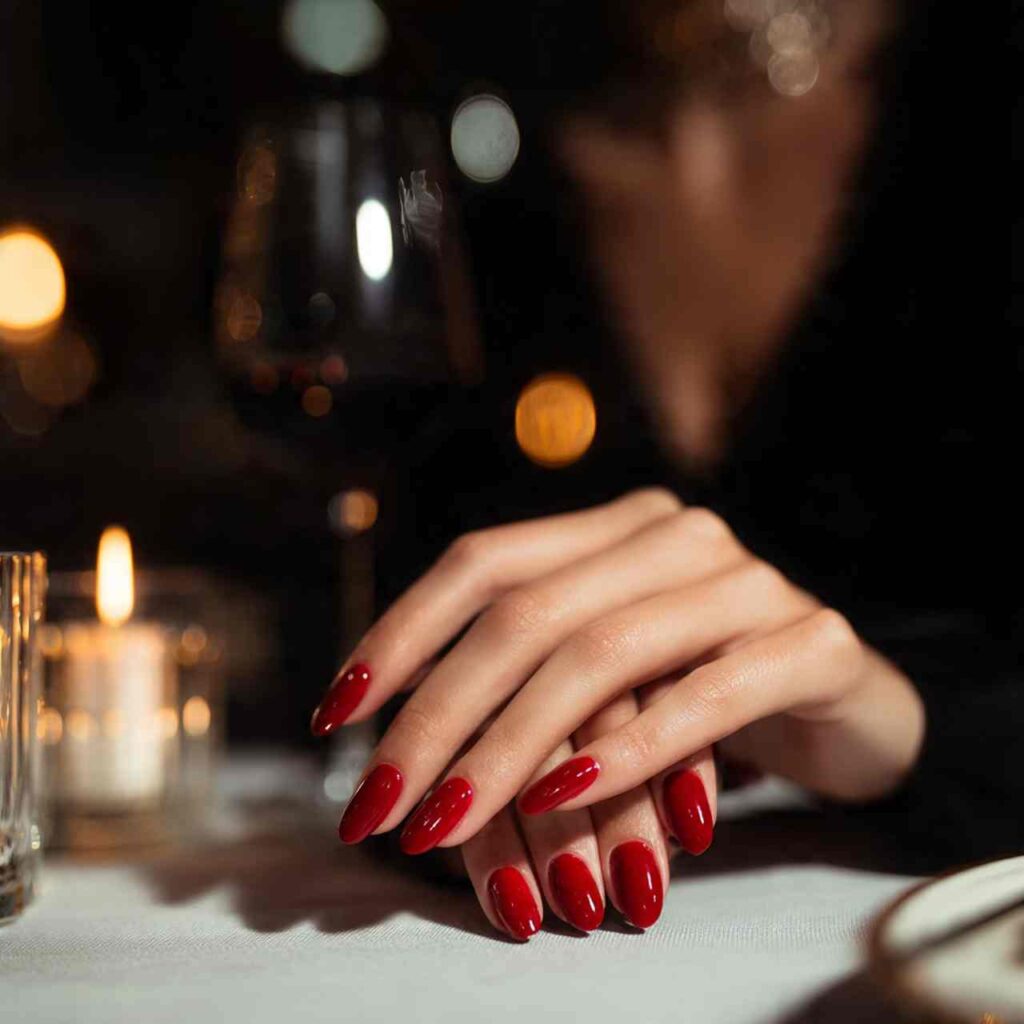 Timeless glossy red in perfect application creates confident elegance. This single-color choice proves that classics remain classic for good reason.