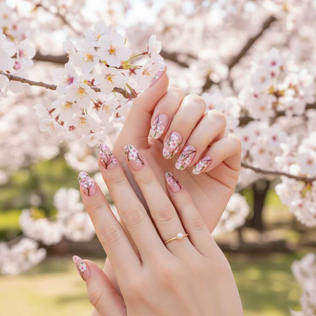 Natural nude base with hand-painted cherry blossom branches creates romantic artistry. The Asian-inspired floral detail adds cultural elegance and springtime beauty.
