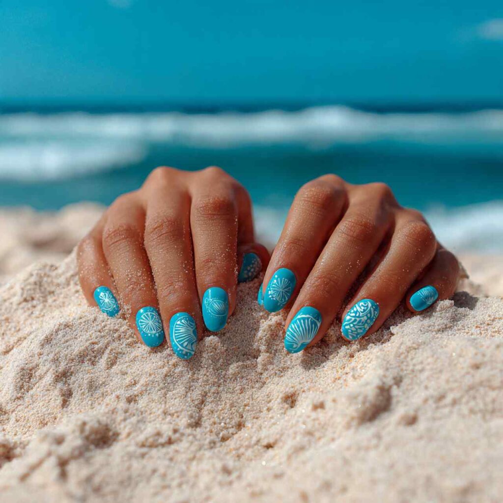 Bright turquoise base with tiny white seashell illustrations creates beachy vacation vibes. The ocean-inspired design brings tropical energy and coastal charm.