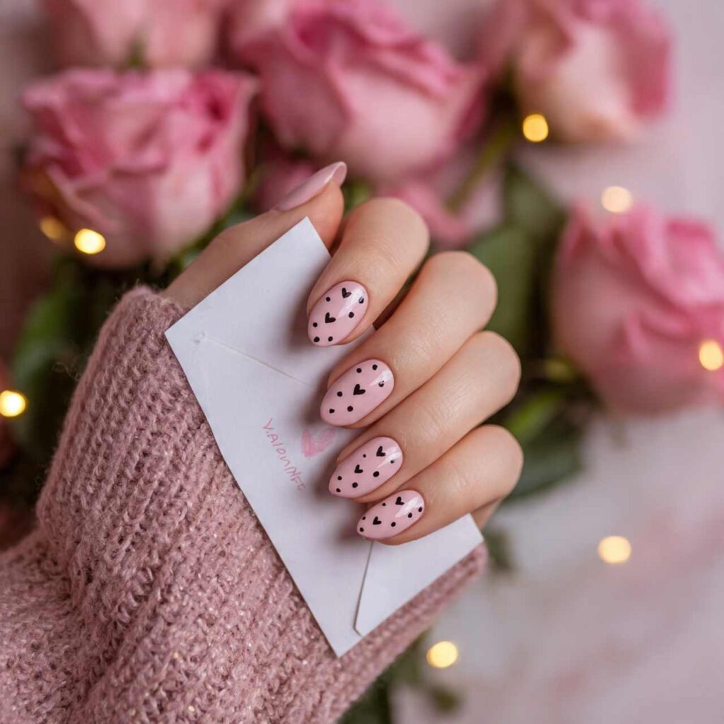 Soft blush pink featuring simple black heart outline drawings creates sweet romance. The minimalist heart illustrations add personality without overwhelming cuteness.