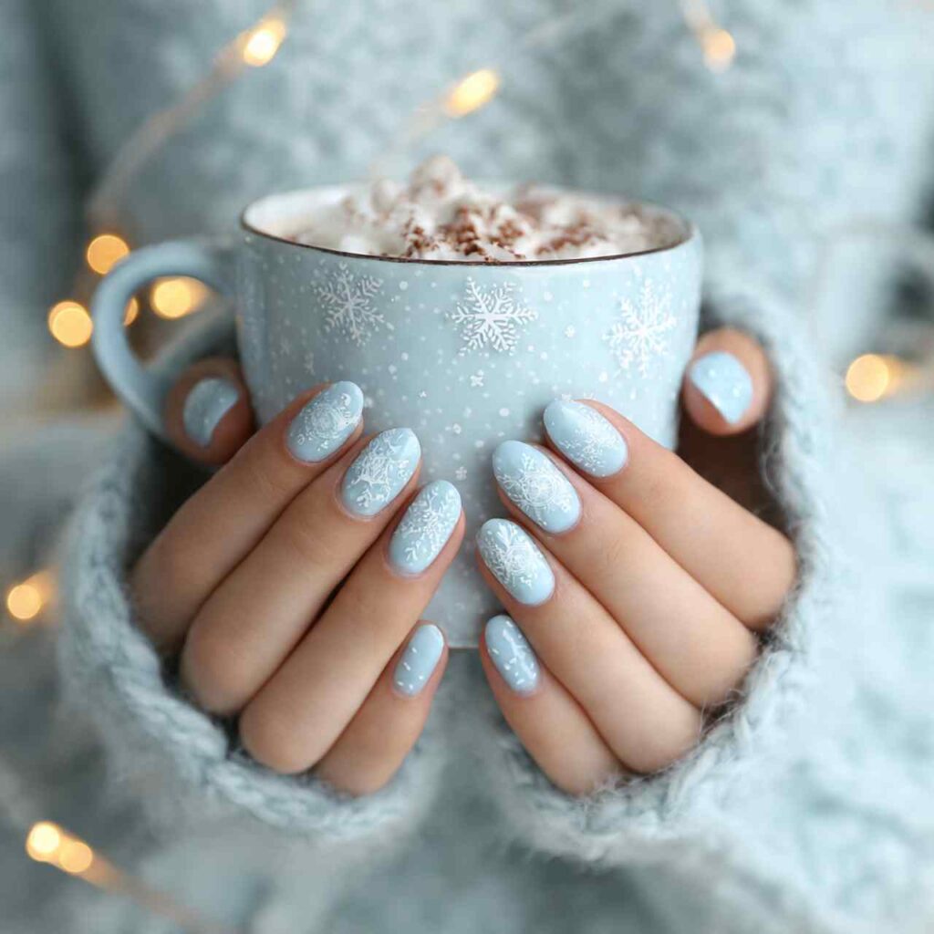 Pale icy blue adorned with white and silver snowflake details creates winter wonderland magic. The frosty color and snowflake theme capture winter’s crystalline beauty.