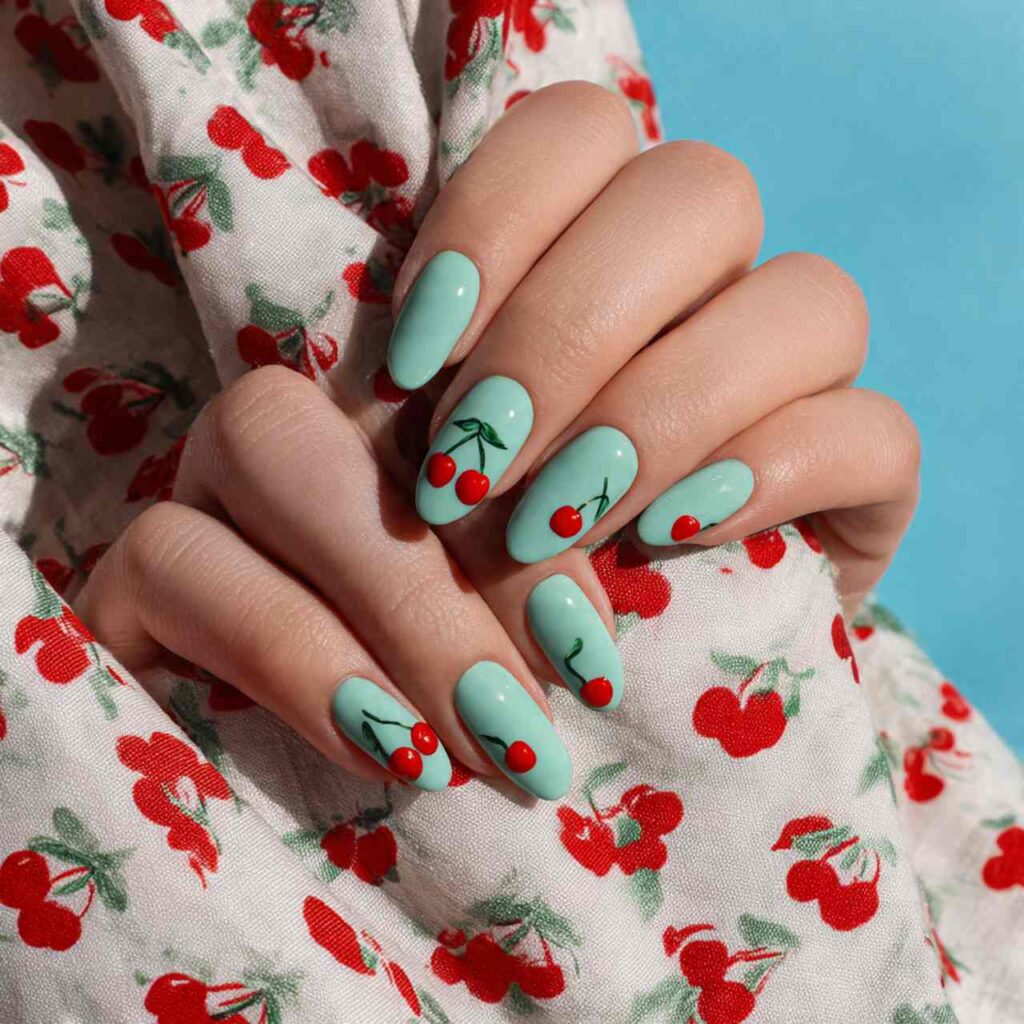 Fresh mint green base featuring playful hand-drawn cherry illustrations creates retro-inspired cuteness. The fruit motif adds personality while the soft green keeps it wearable and fresh.