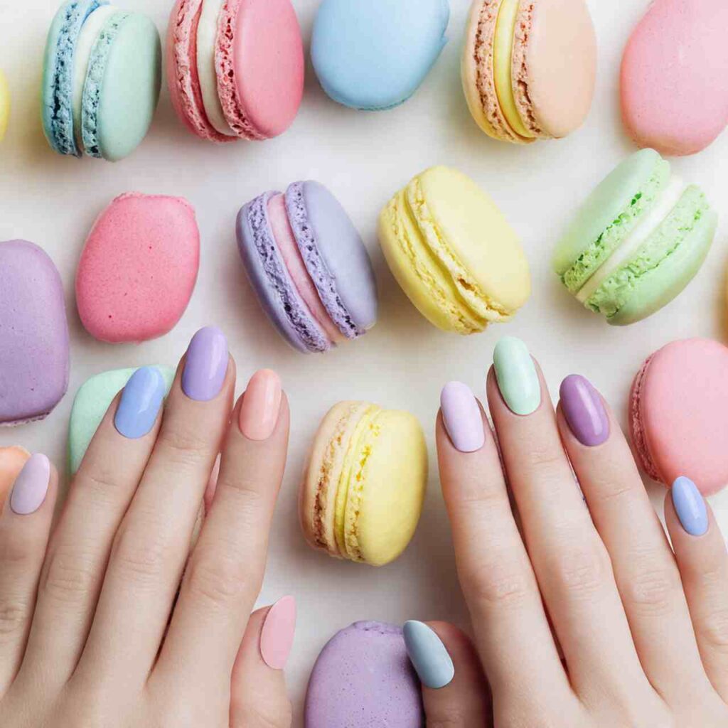 Each nail painted a different soft pastelโbaby pink, lavender, mint, peach, and butter yellowโcreates cheerful diversity. The muted tones keep the rainbow effect sophisticated rather than childish.