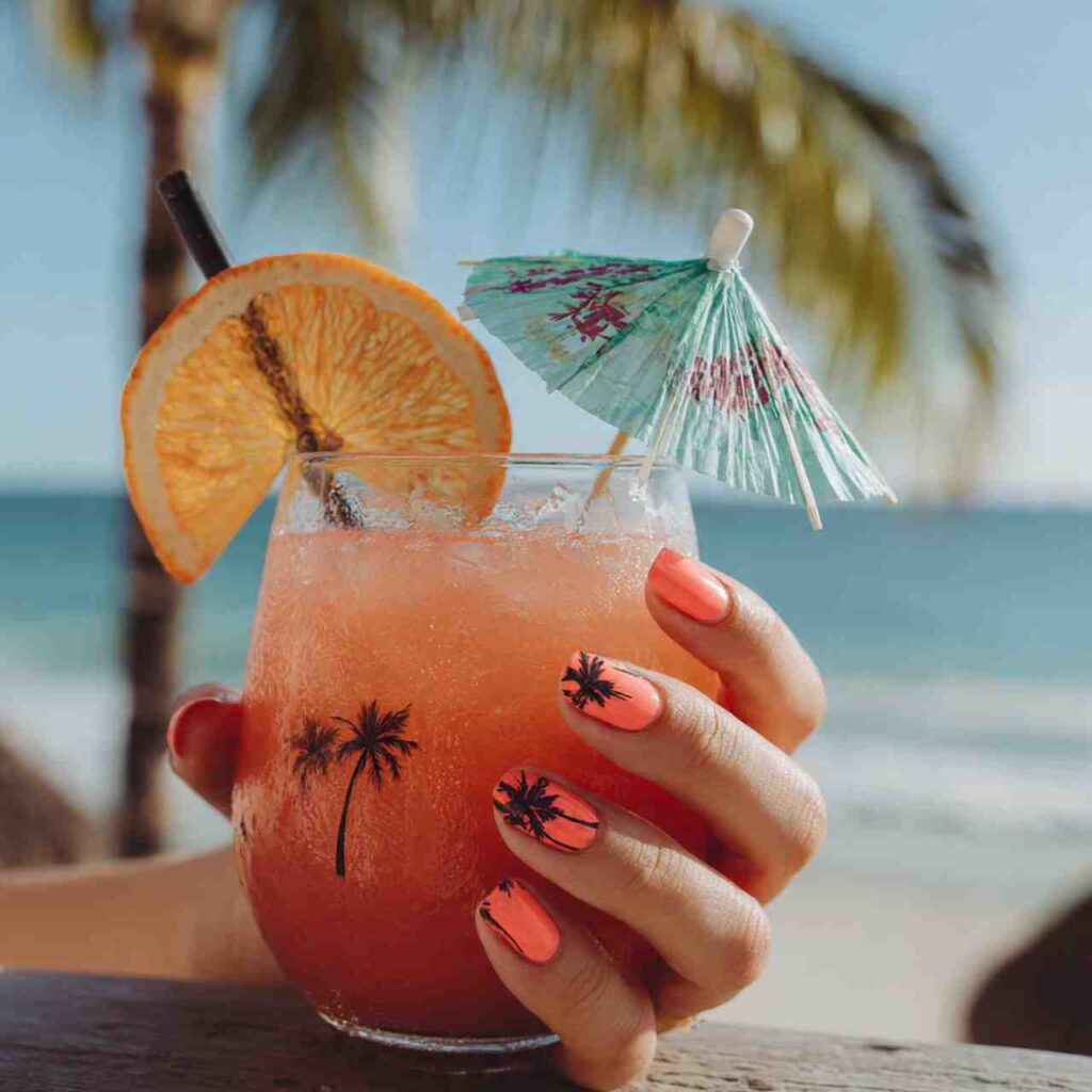 Warm coral base with tiny black palm tree silhouettes creates vacation-ready tropical charm. This playful design brings summer energy even in colder months.