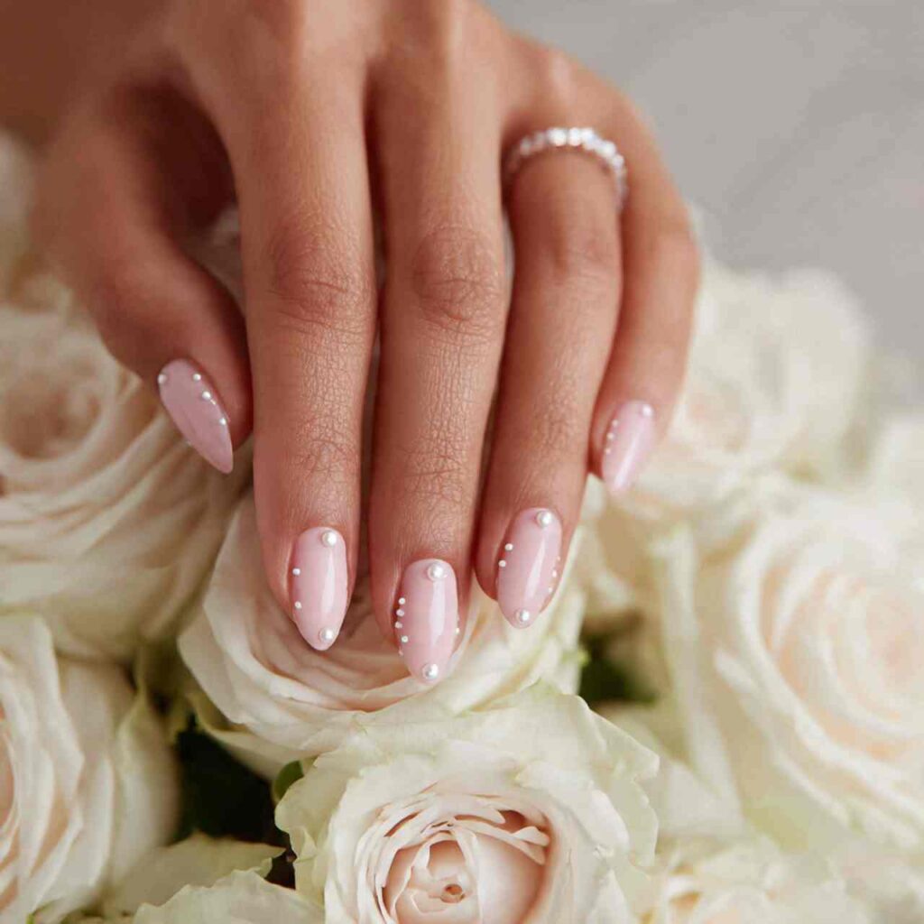 Sweet baby pink base with small pearl embellishments along cuticle line creates delicate glamour. The pearls add dimension without overwhelming the soft color.