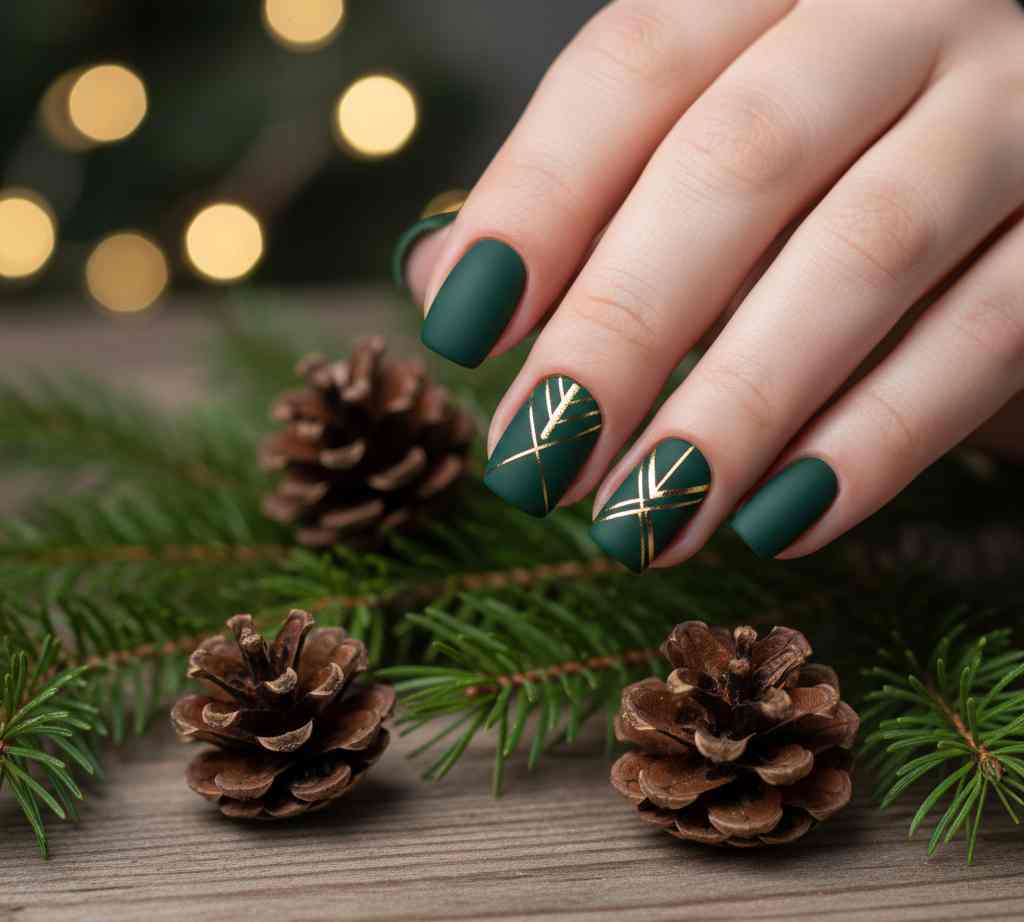 Deep forest green paired with thin gold striping or dots creates a sophisticated, nature-inspired look perfect for winter.
