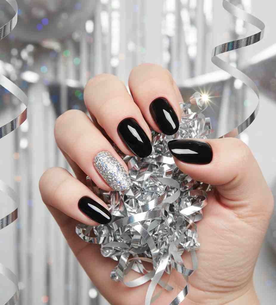 Classic black becomes party-ready with a dusting of silver glitter or a silver glitter accent nail for New Year’s celebrations.