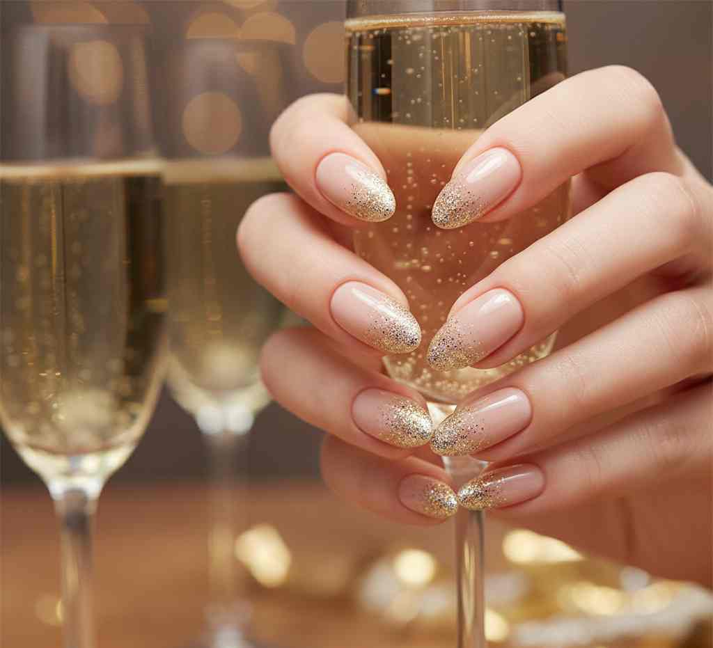 Celebrate the season with a subtle champagne base that transitions into concentrated glitter at the tips, creating an elegant ombre effect.