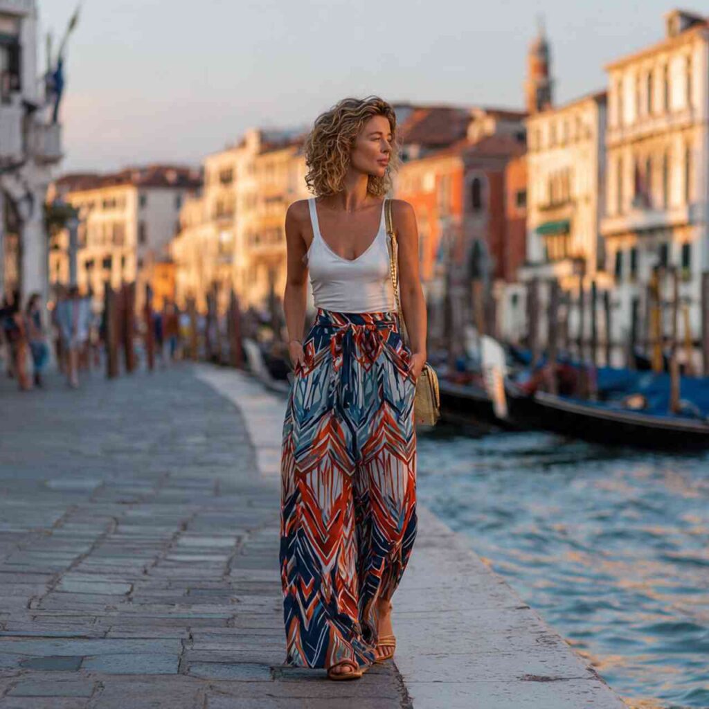 Wide-leg palazzo pants in interesting patterns create statement vacation outfits while keeping you cool and comfortable. This style brings drama and visual interest while the flowing silhouette allows air circulationโperfect for hot vacation destinations. Europeans pair bold bottoms with simple tops for balanced style.
