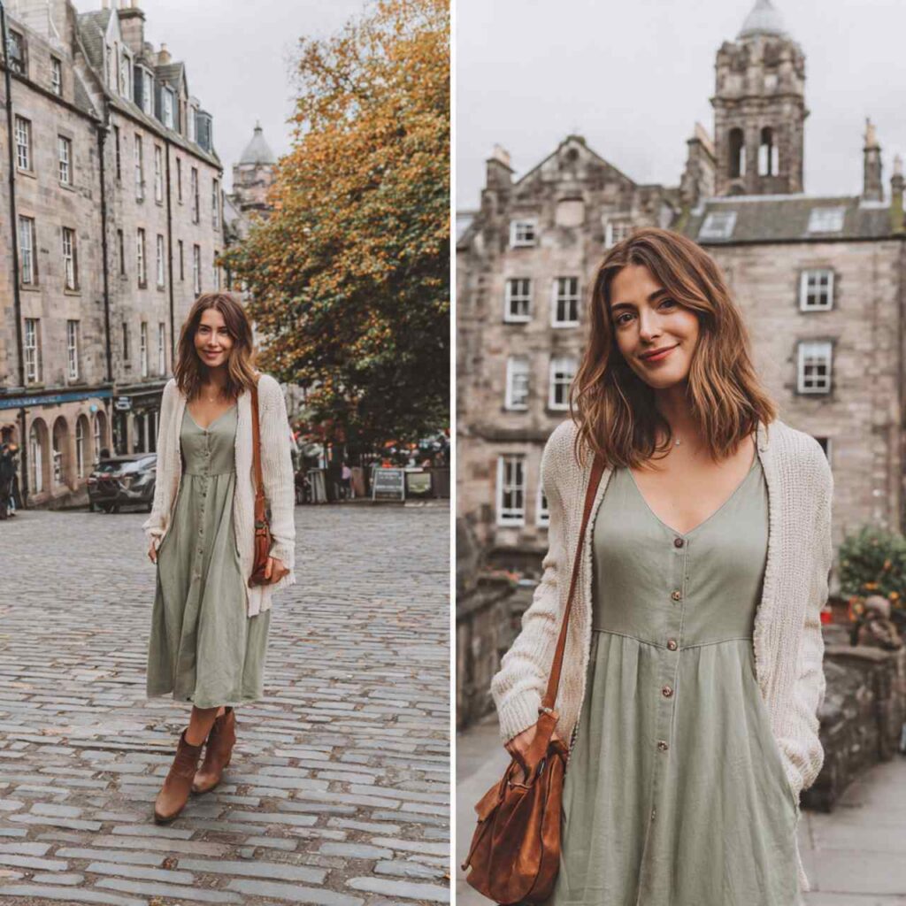 Choose a midi dress in a solid color or simple pattern. Layer a lightweight cardigan in a complementary neutral shadeโcashmere blend, cotton, or linen work depending on climate. The cardigan can be worn buttoned, open, or draped over shoulders. Add flat sandals or low boots and a crossbody bag. This outfit works for museums, indoor attractions, airplane travel, or cooler vacation destinations.