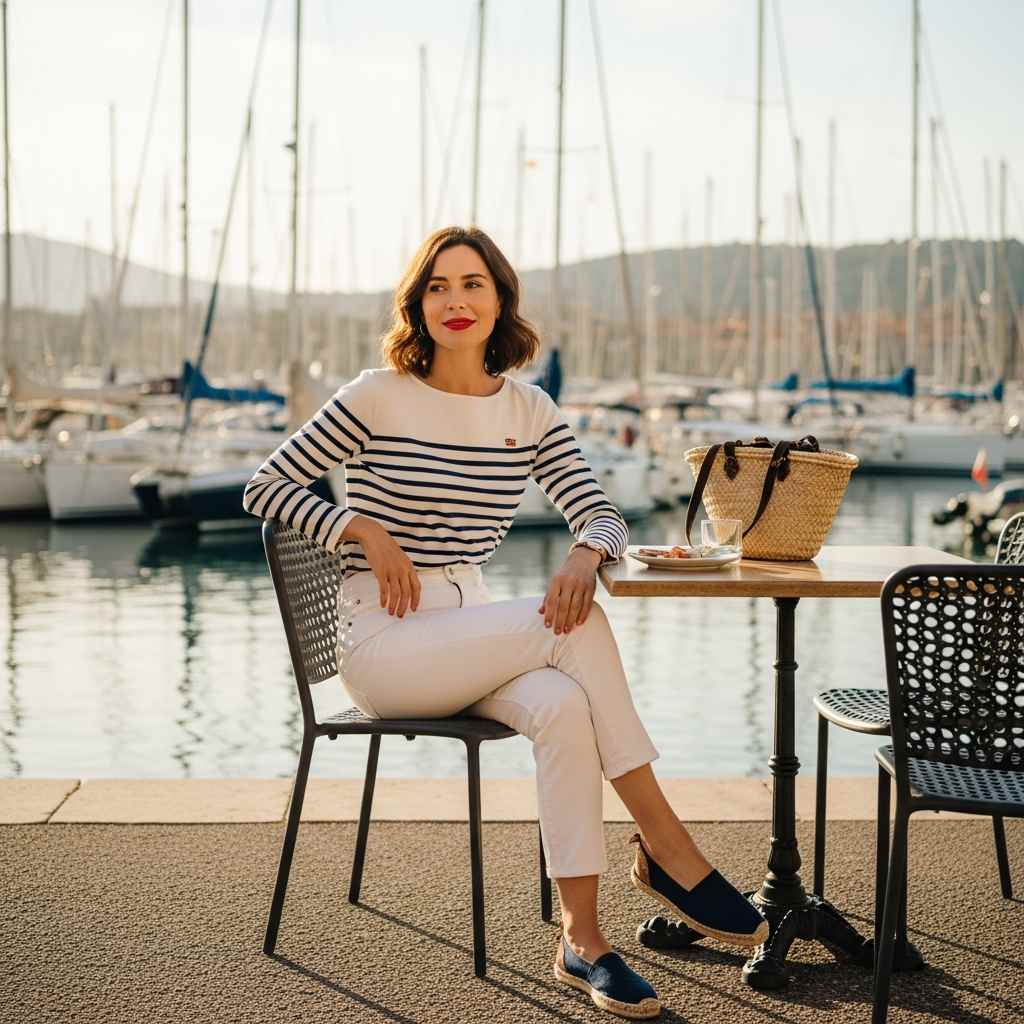 Choose a long-sleeve Breton top in navy and white or black and white horizontal stripes. Pair with high-waisted white jeans in a straight or slightly cropped leg. The contrast between the striped top and crisp white denim creates a classic, photo-ready combination. Add ballet flats or espadrilles, a red lip for that French girl touch, and a woven basket bag. This outfit works beautifully for coastal towns, city exploring, lunch dates, or museum visits.