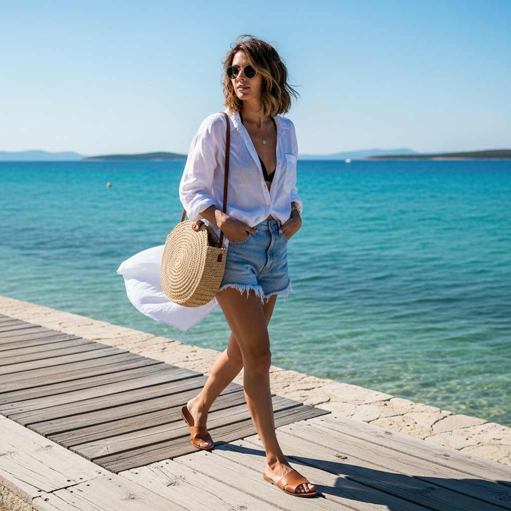 Select an oversized linen button-up in white, soft blue, or natural beige. Leave it mostly unbuttoned over a simple bikini or swimsuit, with the sleeves rolled up. Pair with denim shorts or leave the shirt long as a dress. Add flat sandals and oversized sunglasses. Carry a straw tote for beach essentials. This outfit works for beach days, coastal town exploration, poolside lunches, or casual harbor-side evenings.