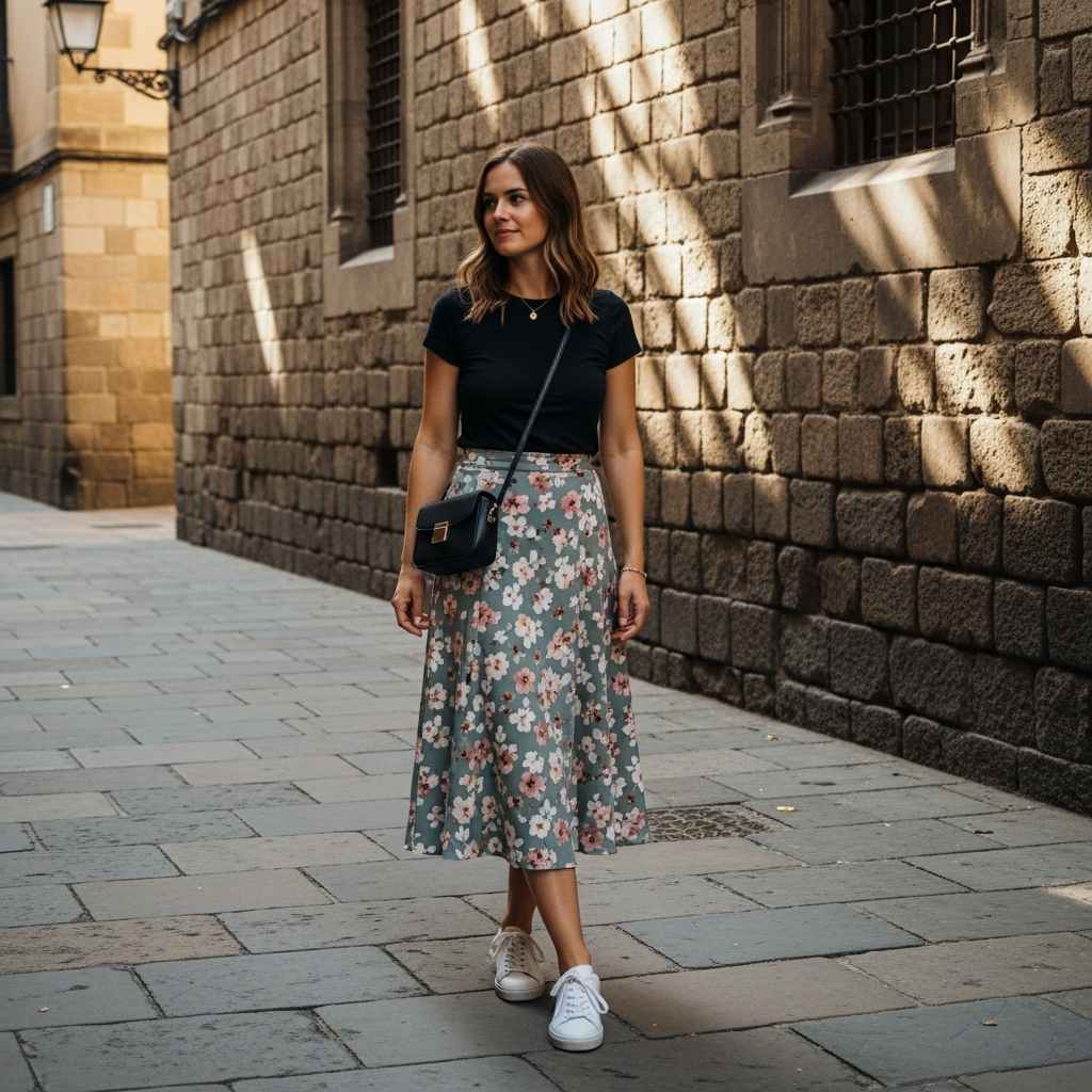 Choose a midi skirt in a solid color or subtle printโthink florals, dots, or abstract patterns. Cotton, linen, or lightweight viscose fabrics work best. Pair with a simple fitted tee in white, black, or a color that picks up a shade from the skirt. Tuck the front of the tee in for shape. Add flat sandals or sneakers and a crossbody bag. This outfit works for city walks, market visits, casual restaurants, or cultural site exploration.
