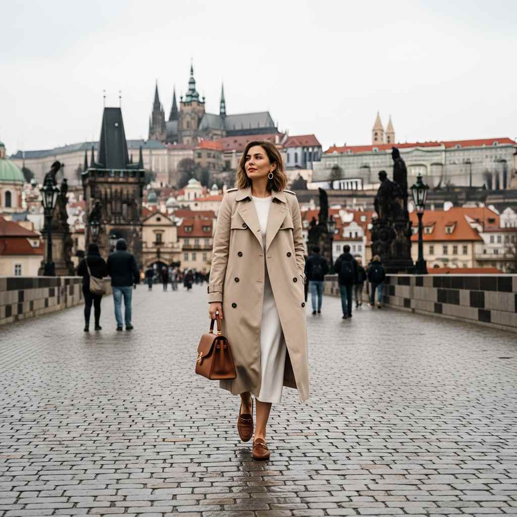 Choose a classic beige or khaki trench coat in cotton or lightweight blend. Underneath, wear a simple midi or maxi dress in complementary neutral tones or soft prints. The trench adds structure and polish to the flowing dress. Pair with loafers or ankle boots depending on weather. This combination works for transitional weather destinations, northern European cities, evening activities, or anytime you need a sophisticated layer.