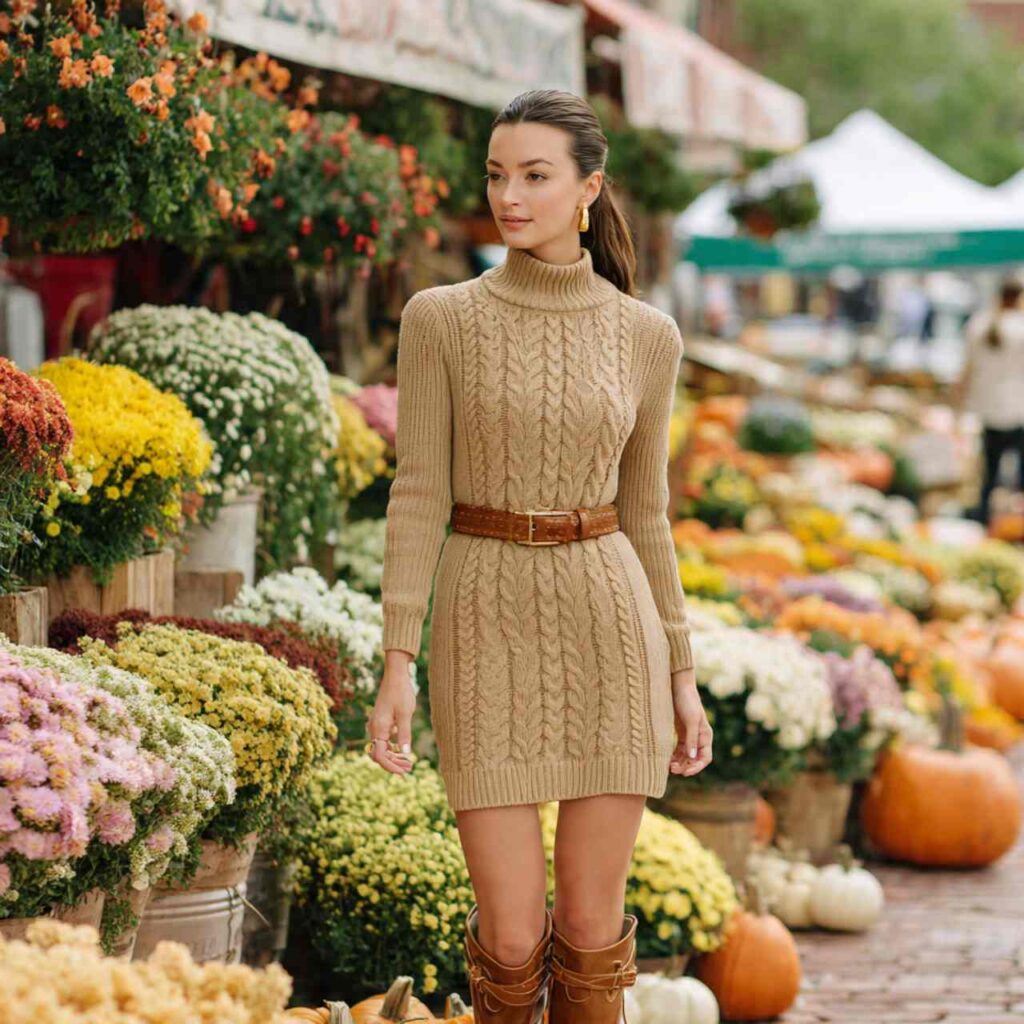 Select a turtleneck sweater dress in fall colors or patterns perhaps a cable knit in camel, or a ribbed style in forest green. The dress should hit around knee length. Pair with ankle boots and add a belt if you want waist definition. Layer tights underneath for warmth. This outfit works for work, casual dates, social gatherings, or anytime you want easy cuteness that requires minimal effort but delivers maximum impact.