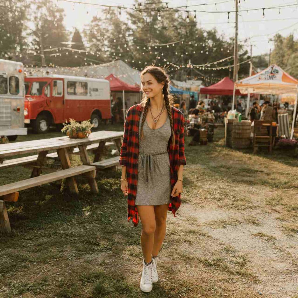 Wear a casual tee or tank dress in solid colors or simple patterns. Add a flannel shirt either tied around your waist or worn open and loose over the dress. Pair with sneakers or ankle boots. This effortlessly cute combination works for casual outings, weekend activities, outdoor events, or times when you want layers you can adjust as temperatures change.
