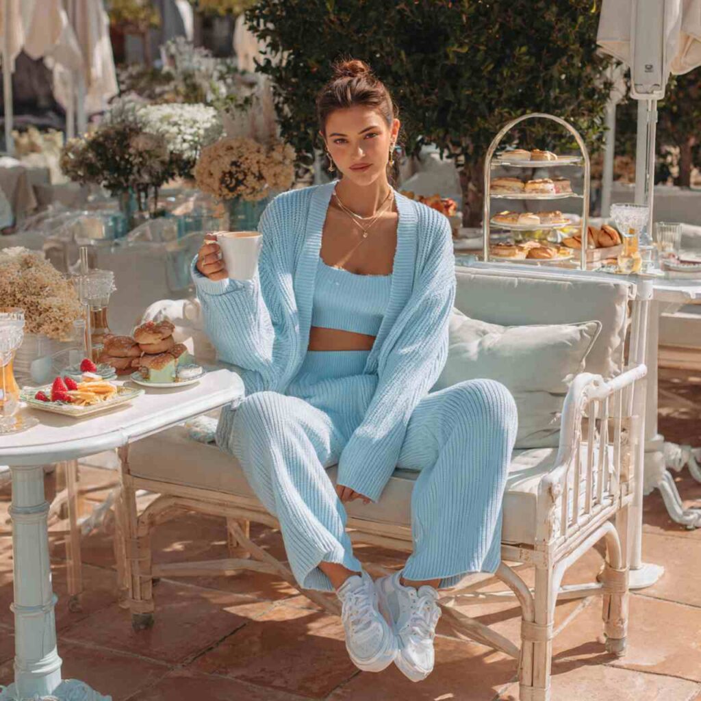 Choose a matching knit set cardigan and pants, or sweater and skirt in colors like powder blue, soft pink, or mint. The matching aspect creates instant polish while the soft colors feel gentle and approachable. Add white or neutral shoes and minimal jewelry. Works for brunches, shopping trips, casual work days, or anytime you want coordinated cuteness with minimal styling effort.