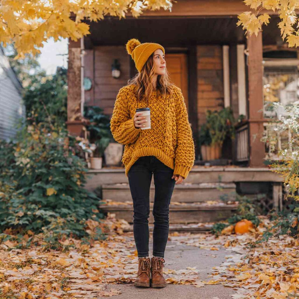 Wear a chunky sweater in a standout fall color perhaps mustard, rust, or teal. Add a matching beanie in the same shade. Pair with neutral jeans and boots. The matching color creates cute cohesion that shows attention to detail. Works for outdoor activities, casual plans, coffee dates, or cold weather when you need that beanie anyway.