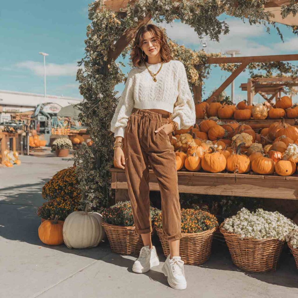 A cropped sweater paired with high-waisted bottoms creates cute proportions that flatter various body types. This combination shows just a hint of waist while remaining modest and comfortable.