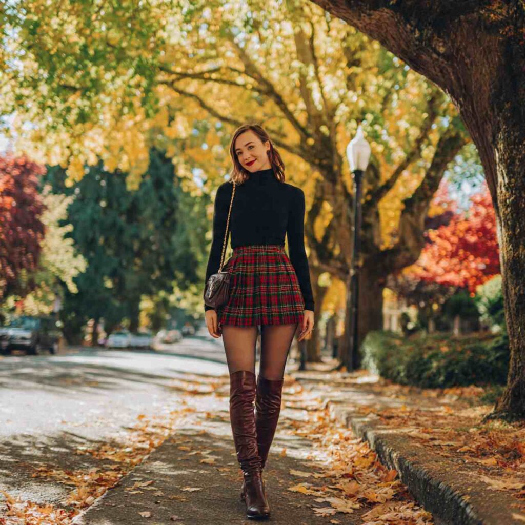 Select a plaid mini skirt in traditional fall colors reds and greens, browns and creams, or navy and burgundy. Pair with a fitted turtleneck or cropped sweater tucked in. Add knee-high boots in brown or black leather. Tights add warmth and polish. This outfit works for dates, girls’ nights out, social events, or anytime you want to feel cute and confident. The preppy elements feel fresh and youthful without being costume-like.