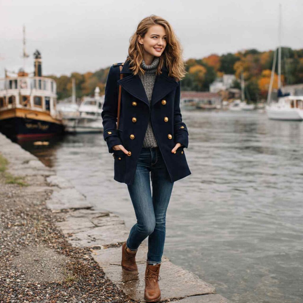 Layer a peacoat in classic colors navy, camel, or red over basic outfits like turtlenecks and jeans. The coat’s structure and double-breasted buttons add cute, nautical-inspired charm. Add ankle boots or loafers. This combination works for commuting, professional casual settings, dinner plans, or anytime you want casual outfits to look slightly more elevated.