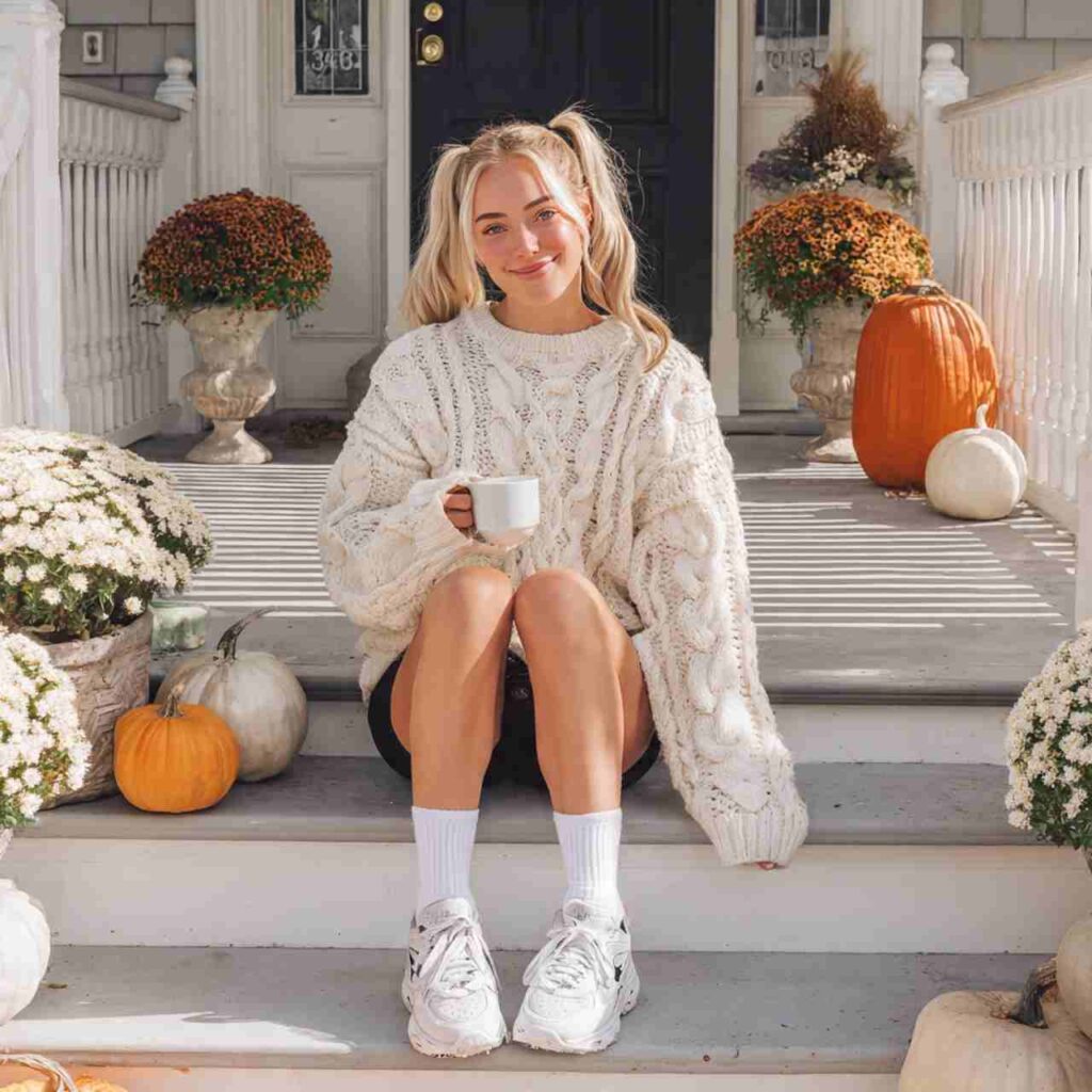 The combination of an oversized cozy sweater with bike shorts creates that perfect “cute but comfortable” aesthetic. This outfit balances proportions beautifully while maintaining a relaxed, approachable vibe that’s ideal for casual fall days.