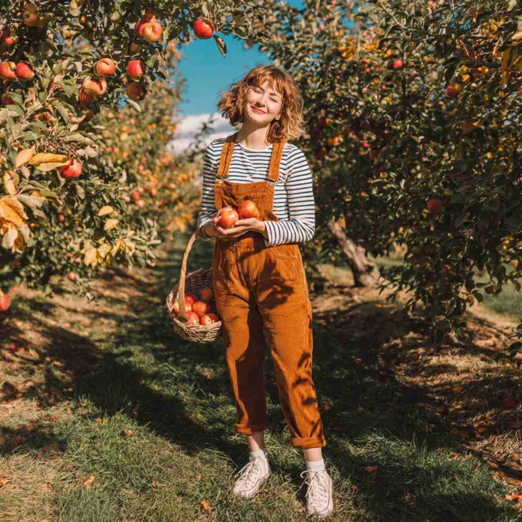 Select corduroy overalls in fall colors like rust, forest green, or caramel. Layer a long-sleeve striped tee underneath in complementary colors. Style with one or both straps fastened depending on your mood. Add white sneakers or ankle boots. This outfit channels vintage vibes while feeling completely current, working for apple picking, craft fairs, casual gatherings, outdoor activities, or creative workspaces.