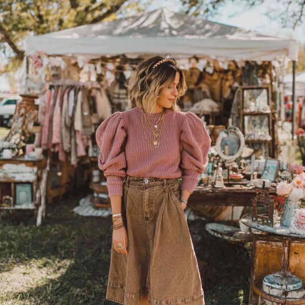 Choose a puff sleeve sweater in soft fall colors dusty pink, sage green, or cream. Pair with a denim midi or mini skirtโthe length depends on your preference and comfort. Add tights as weather demands. Complete with ankle boots or Mary Jane shoes. This outfit works for brunches, casual dates, shopping trips, lunch with friends, or any occasion wanting feminine sweetness with casual ease.