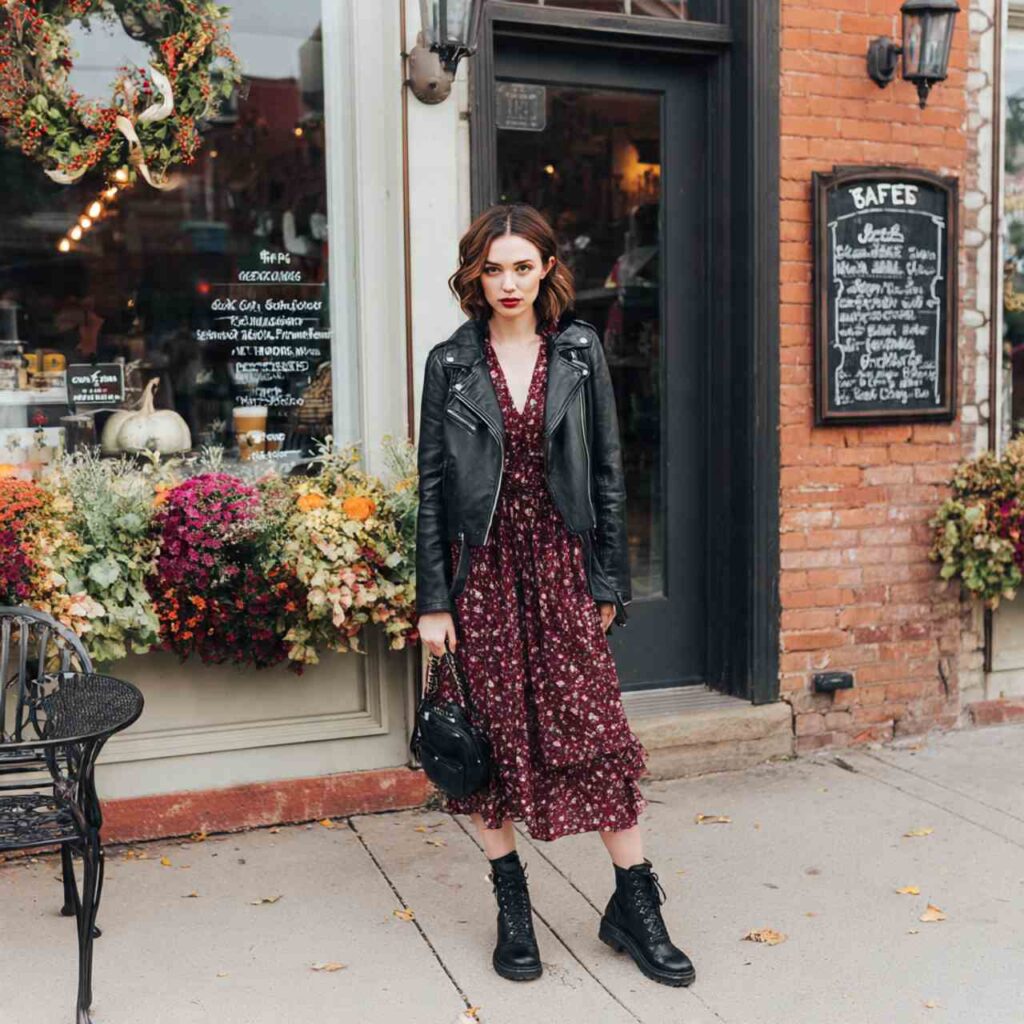 Select a floral midi or mini dress in fall florals muted tones rather than bright summery patterns. Layer a fitted leather or faux-leather jacket over it. Add combat boots or ankle boots and a crossbody bag. This juxtaposition creates interesting style tension that feels current and confident. Works for concerts, casual dinners, weekend outings, or dates where you want to look cute but not overly precious.