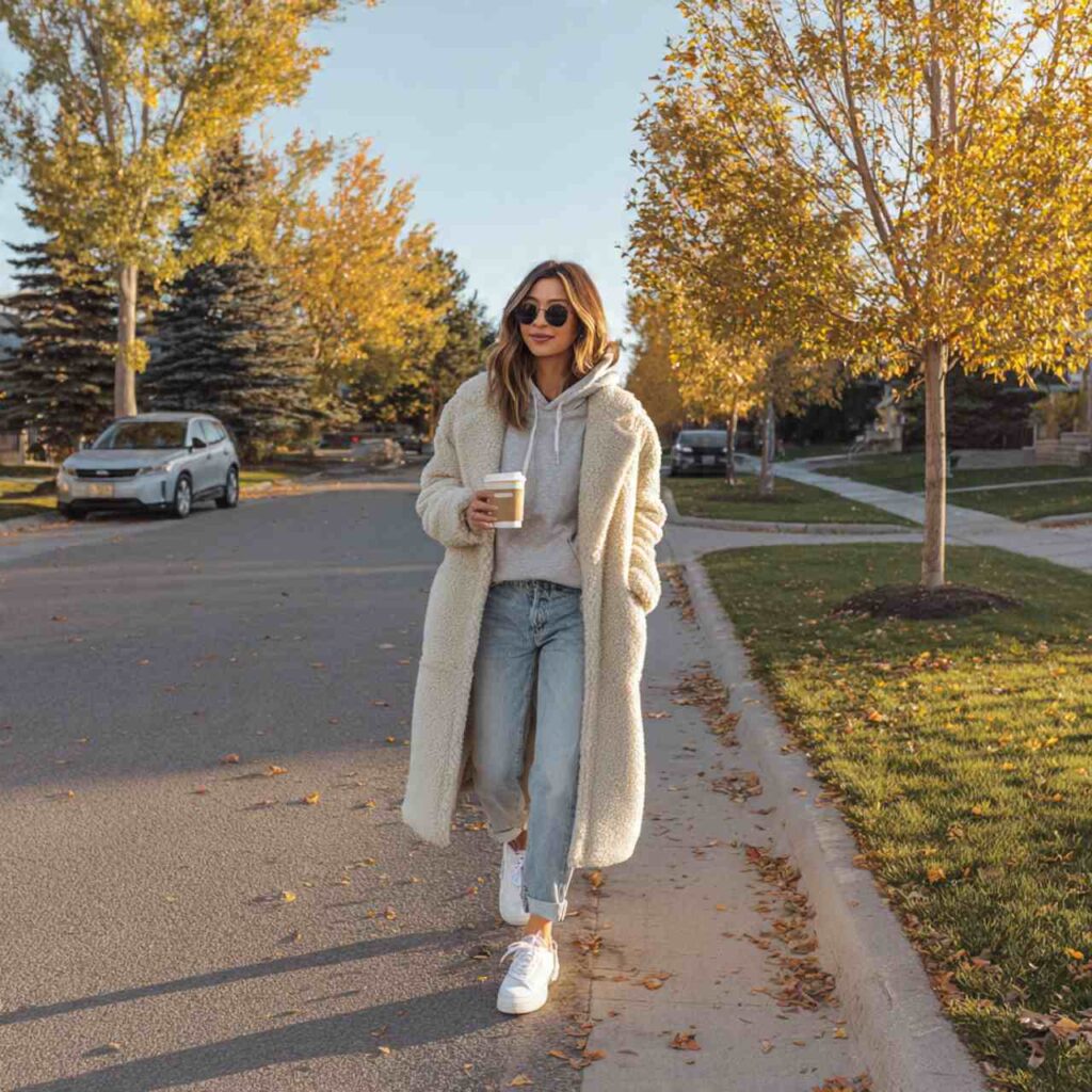 Choose a teddy coat in cream, tan, or brown the fuzzy texture is key. Wear it over a hoodie and your favorite jeans with sneakers. The unexpected combination of athletic hoodie with plush coat creates casual-cute magic. This outfit works for running errands, casual meetups, movie outings, travel days, or anytime you want maximum coziness with cute factor.