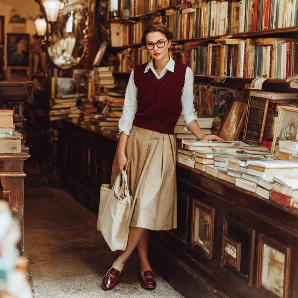 Select a sweater vest in fall patterns or solids perhaps argyle, fair isle, or solid burgundy. Layer over a white or chambray collared shirt with the collar showing. Pair with pleated pants, a midi skirt, or jeans. Add loafers or oxfords. This outfit works for casual work environments, coffee shop studying, book club meetings, or smart-casual social occasions.