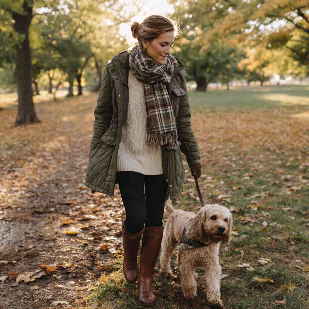 Choose a quilted jacket in fall colors olive, navy, or burgundy. Wear it over a long tunic sweater or oversized tee with leggings. Add tall riding boots or over-the-knee boots. A scarf adds extra coziness. This outfit works for outdoor activities, casual work-from-home days with errands, school drop-offs, or active weekends wanting comfort with style.