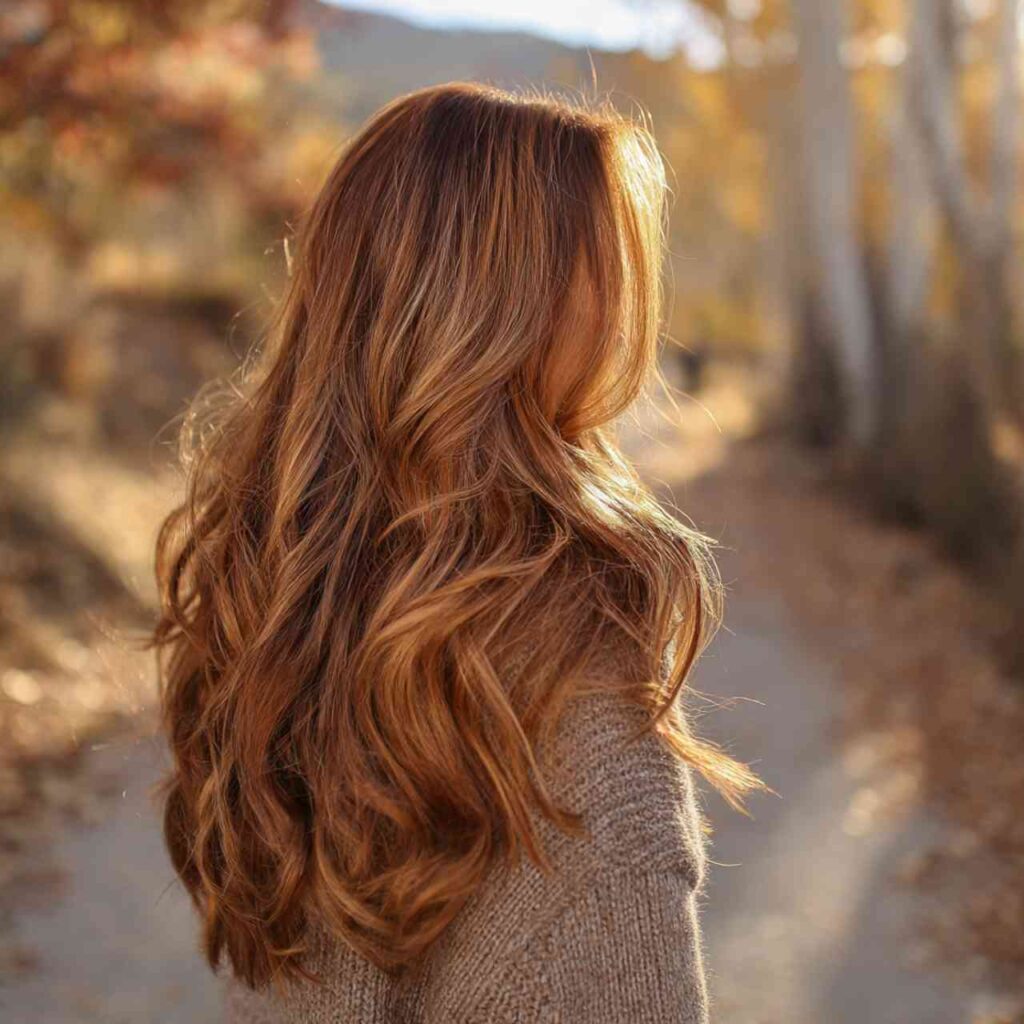 Classic auburn base enhanced with golden blonde highlights creates dimensional warmth. The contrast between rich red-brown and bright gold adds movement and complexity.