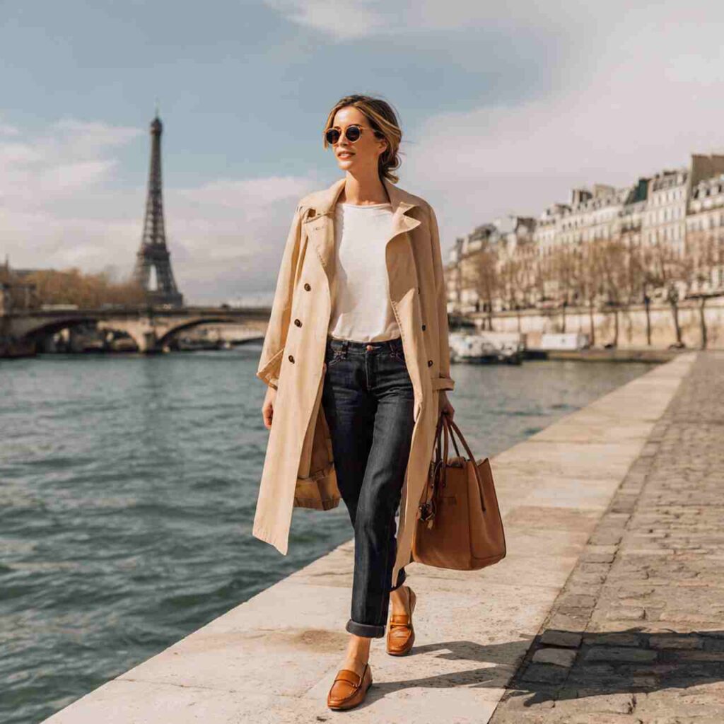 The quintessential European spring uniform—classic trench coat over simple jeans and white tee with leather loafers creates timeless sophistication that works from Paris to Prague.