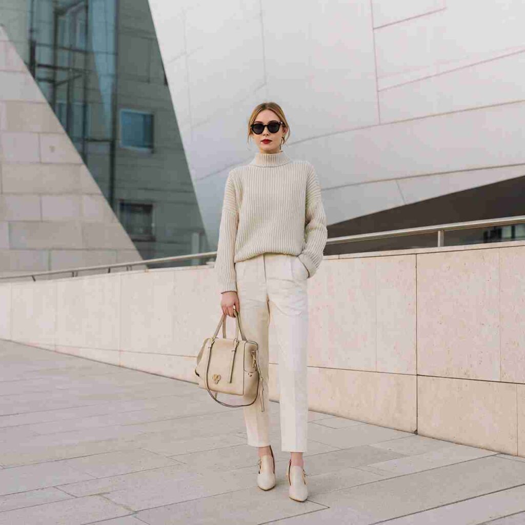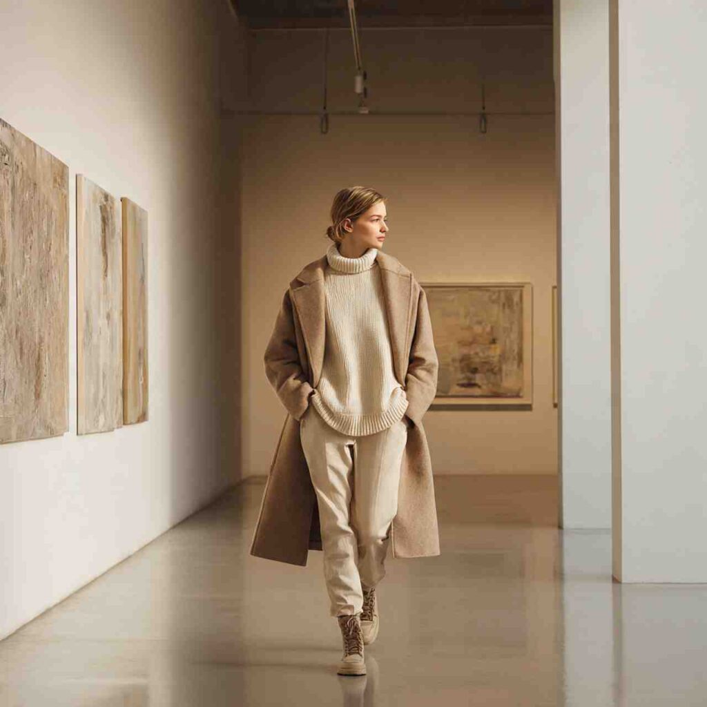Head-to-toe coordinated neutrals—cream knit, beige trousers, tan coat—creates sophisticated minimalism central to Scandinavian and German aesthetic.