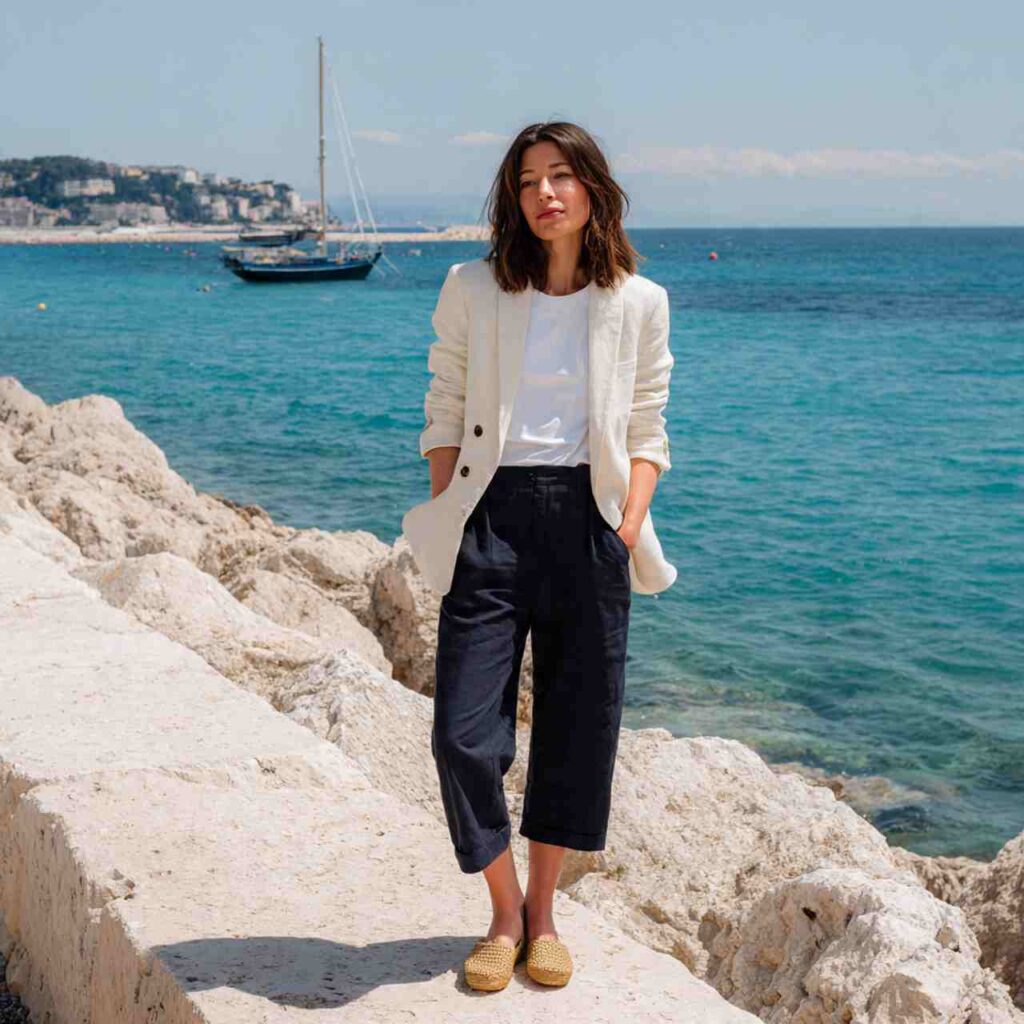 An unstructured linen blazer over simple tee with cropped pants creates that relaxed European summer-approaching aesthetic.