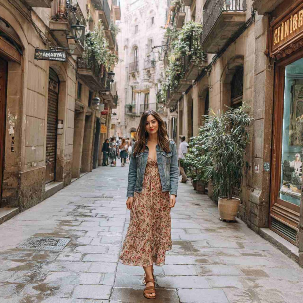 The European casual classic—vintage-inspired denim jacket over flowing dress creates the perfect blend of structured and feminine, casual and elegant.