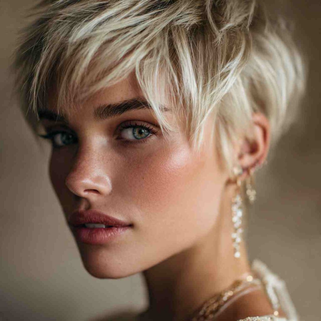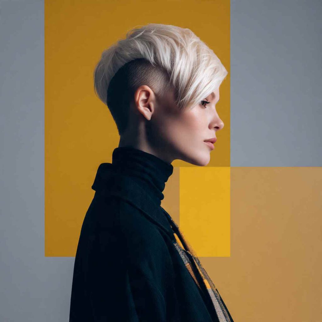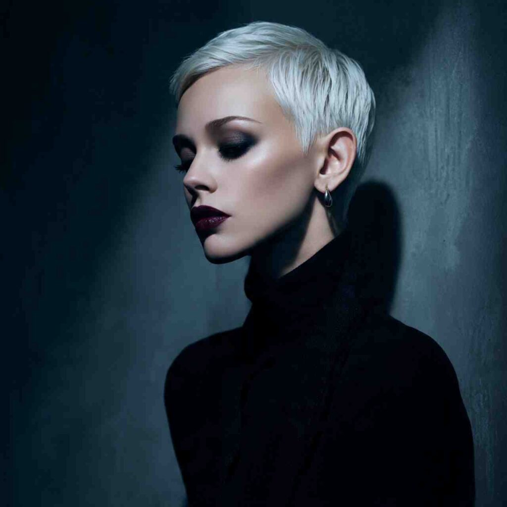 Ultra-short pixie in platinum blonde creates high-impact drama. The light color emphasizes the cut’s architecture while making a powerful style statement.