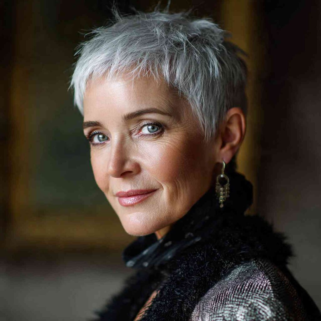 Short pixie in sophisticated silver gray creates age-defying elegance. This color choice transforms pixies into statements of confidence and embracing natural beauty.