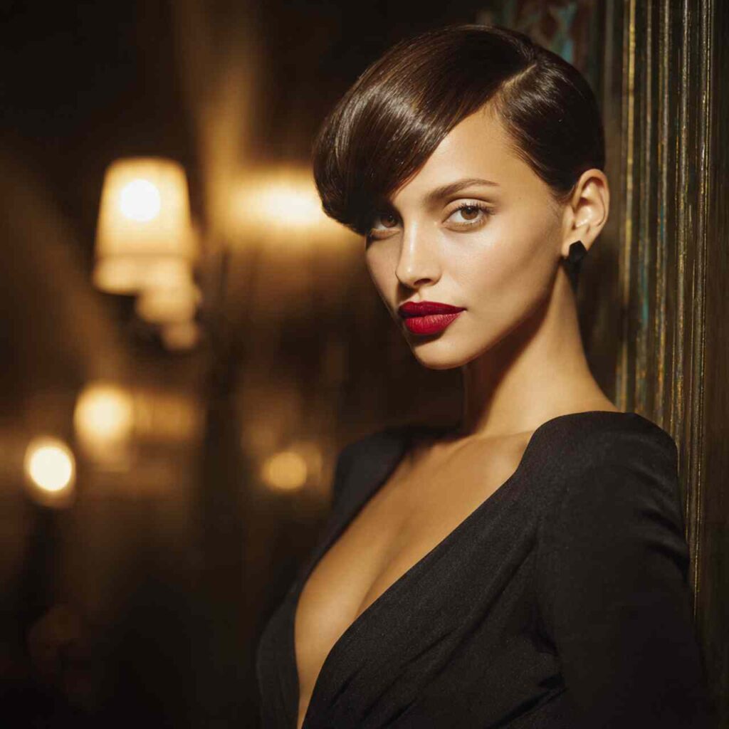 Ultra-smooth pixie styled flat with dramatic side part creates sophisticated polish. This refined approach emphasizes shine and precision cutting for elegant occasions.