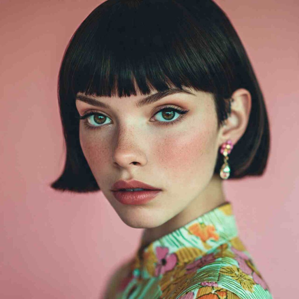 Short pixie paired with very short straight-across bangs creates retro-futuristic impact. This combination makes bold fashion statement while maintaining surprising wearability.