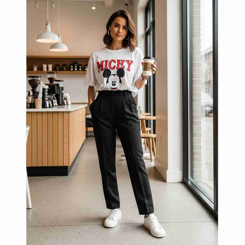 Why it works: The tailored trousers ground the playful graphic tee, making it appropriate for casual workplaces or lunch dates. The vintage Mickey adds a touch of Disney magic without overwhelming the outfit.