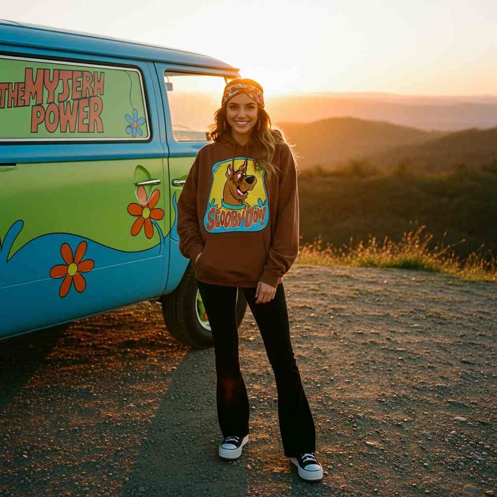 A cozy hoodie featuring Scooby-Doo and the Mystery Machine logo paired with flared leggings and platform shoes channels ’70s nostalgia with cartoon charm.