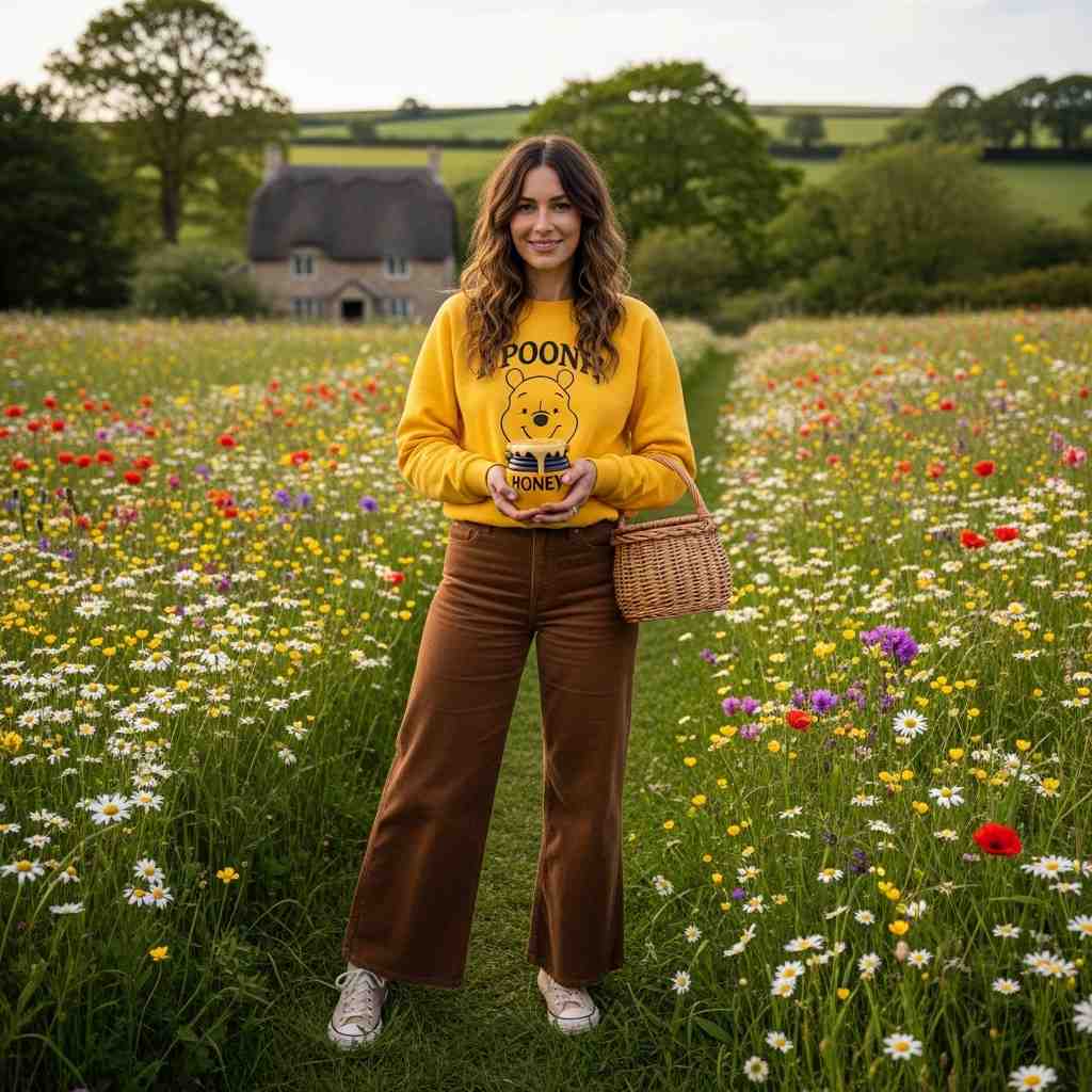 A soft yellow sweatshirt featuring Winnie the Pooh logo paired with brown corduroy pants creates a cozy, cottagecore-inspired spring outfit.
