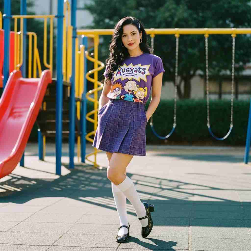 A ’90s-style tee featuring the Rugrats logo paired with a plaid mini skirt and knee-high socks creates nostalgic schoolgirl energy with a playful twist.