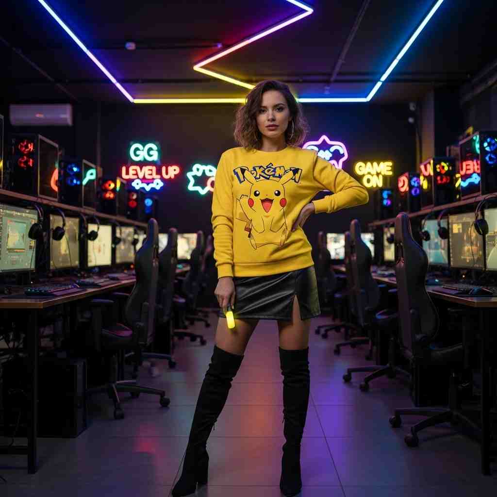 A cozy sweatshirt featuring Pikachu or Pokémon logo paired with a denim or leather mini skirt and tall boots creates gamer-girl style.