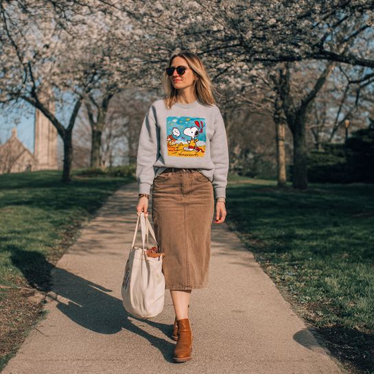 A cozy crewneck sweatshirt featuring Snoopy in a spring scene paired with a classic denim midi skirt and ankle boots brings Peanuts charm to your everyday wardrobe.