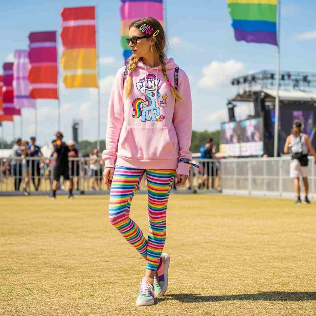 A pastel hoodie featuring My Little Pony logo paired with rainbow-striped leggings and colorful sneakers creates maximum playful color and childhood nostalgia.