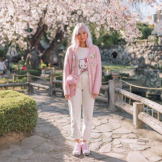 A pastel pink cardigan featuring subtle Hello Kitty embroidered logos paired with crisp white straight-leg jeans creates a sweet, Kawaii-inspired spring look.